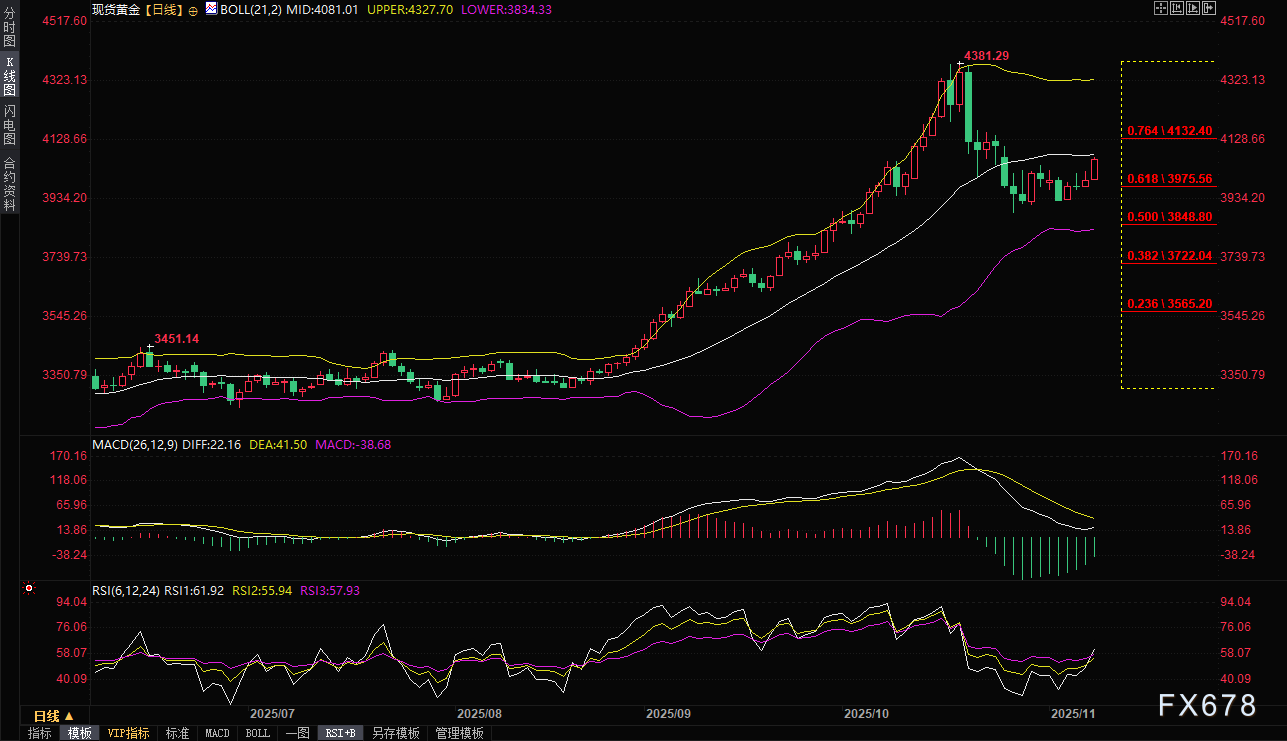 EBC官网——现货黄金在周一(11月10日)亚洲时段攀升至4050美元上方,截止14:05,最高触及4071.14美元/盎司,为近两周新高,涨幅约1.75%。对美国经济前景不确定性的担忧为金价提供上涨动能。交易员在美国私人就业数据疲软以及密歇根大学(UoM)消费者信心指数调查偏悲观后,加大了对美联储降息的押注。较低的利率可能降低持有黄金的机会成本,从而支撑这一无收益贵金属。