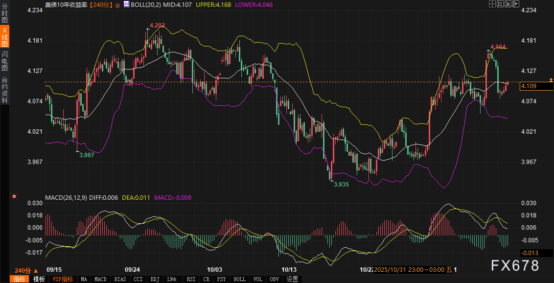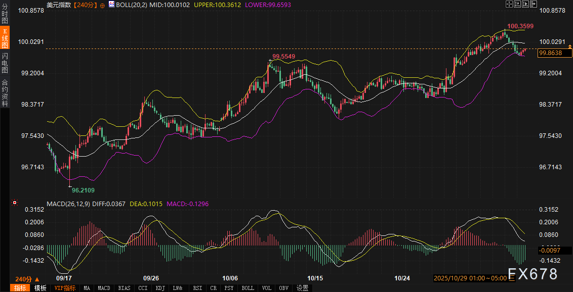 将基本面与技术面融合,可以更清晰地看到美元与美债走势的内在逻辑。美元指数在240分钟周期上,当前报价99.8500,处于布林带中轨100.0096附近,上轨100.3616与下轨99.6579间的通道宽度适中,暗示短期波动空间有限。MACD指标显示DIFF线为0.0358,DEA线为0.1014,二者均呈正值但DIFF低于DEA,柱状图动能趋于收敛,反映出美元的多头动能虽未衰竭,却面临上行动能的钝化。结合美联储扩表预期,这一技术格局可解读为:储备扩张注入的流动性,可能通过压低美债收益率,间接削弱美元的相对吸引力,导致指数在中轨附近筑顶。