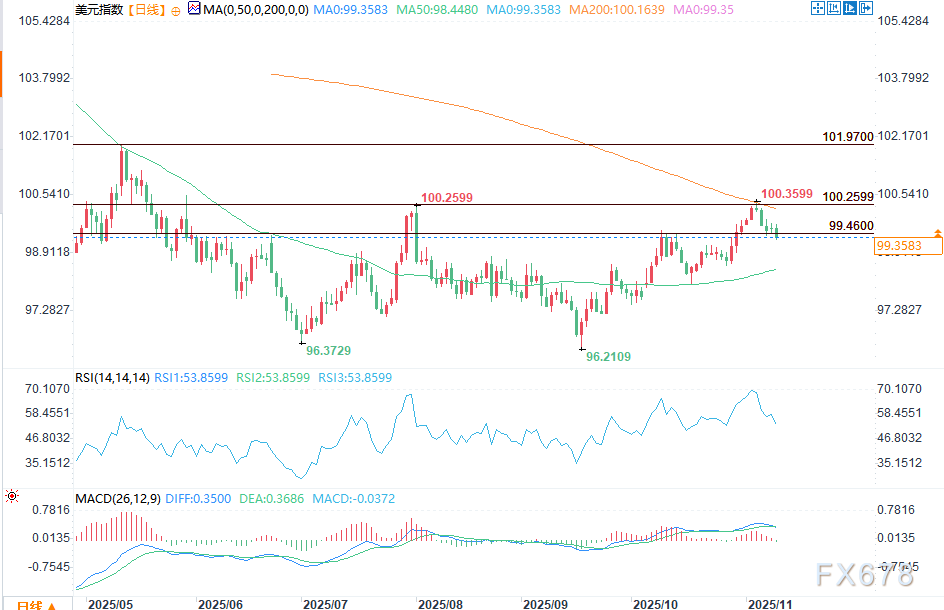 汇通财经APP讯——周二(11月11日)美盘时段,美元指数小幅走低,延续上周高点以来的回调态势。交易员对劳动力市场疲软的新信号作出反应,同时等待大量延迟发布的政府数据。盘中时段,美元指数跌破短期枢轴位99.463,跌幅0.26%至99.3604。价格走势开始远离200日均线100.209及近期主要高点100.360。
