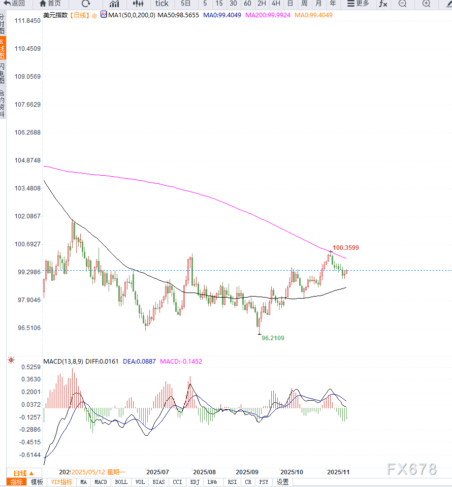 14日RSI位于55-60区间,尚未进入超买区间,表明上行动能仍有余地。若指数有效突破99.80阻力区,可能进一步上行至100.30附近的短期目标;下方支撑位于99.20,若失守,则可能回调至98.70区域,短线偏多结构或被破坏,需关注回调力度和成交量配合确认。